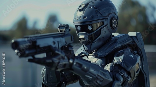 Intense training session of a robotic SWAT officer at an outdoor range, detailed close-up capturing the precision during daylight