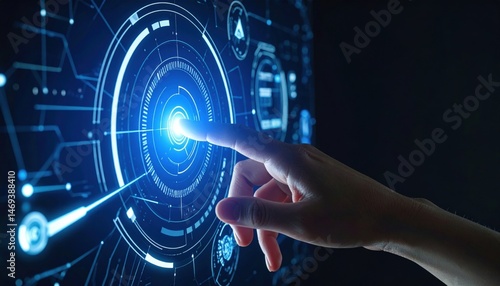 Interacting with futuristic touchscreen interface digital environment technology visualization high-tech setting close-up perspective