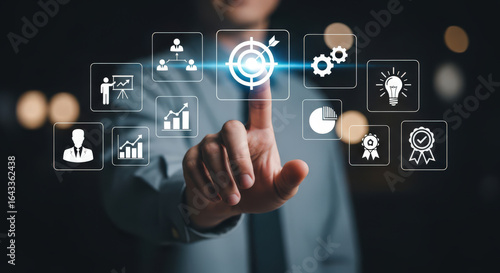 Interactive Business Strategy and Goal Achievement A Person Touching a Digital Interface Displaying Icons Representing Planning Development and Success