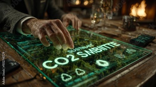 Interactive CO2 Sustainability Display Hands Engaging with Futuristic Technology for Environme