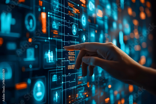 Interactive Data Visualization Illustration: Hand Selecting Information on Futuristic Touchscreen Interface