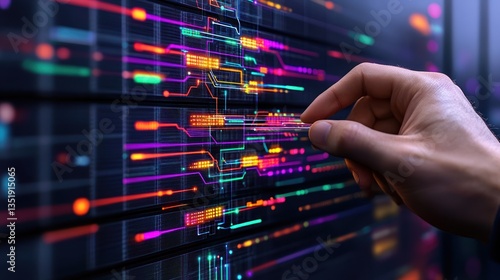 Interactive Digital Network: A Hand Interacting with a Futuristic Data Visualization on a Server Rack