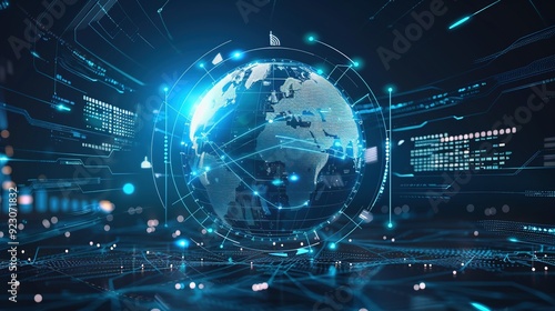 Interactive Educational Experience Featuring a Blue Hologram Globe with World Map and Glowing Data Streams: AI Global Communication Networks, Virtual Reality Simulations, Geospatial Data Visualization