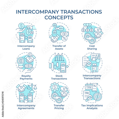Intercompany transactions soft blue concept icons. Interaction between commercial entities. Financial activity. Icon pack. Vector images. Round shape illustrations for presentation. Abstract idea