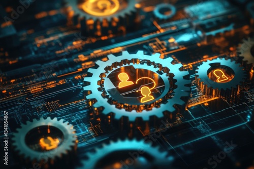 Interconnected gears represent teamwork, collaboration, and the synergy of human resources in a technological landscape.
