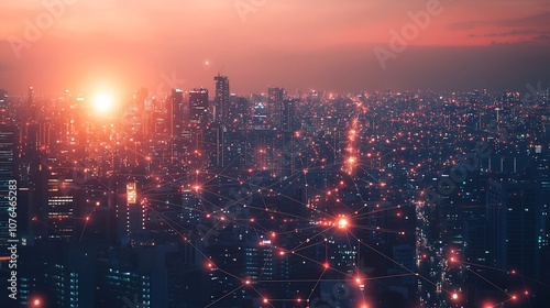 Interconnected Smart City Skyline with Glowing Networks and Surveillance Systems