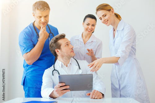 Interested medical workers disturbing their colleague using tablet computer