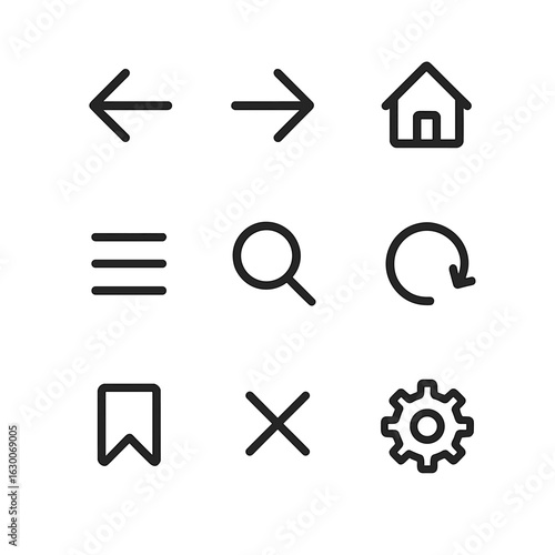 Interface Icon Set. Outline icon set of interface navigation: back arrow, forward arrow, home, menu, search, refresh, bookmark,