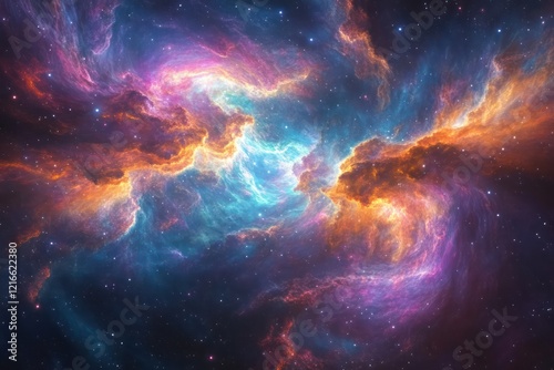 Intergalactic sky with swirling, colorful nebulas spreading across a star-studded canvas, filled with cosmic energy and mysterious light