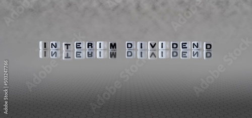 interim dividend word or concept represented by black and white letter cubes on a grey horizon background stretching to infinity