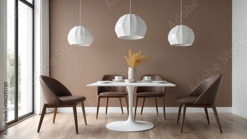 Interior design of modern dining room with brown chair and white table, minimalist style
