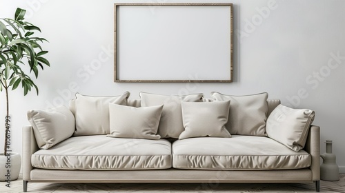 interior design of modern living room with beige fabric sofa and cushions. White wall with frame and space for text, living, furniture