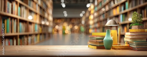Interior library scene with books and a teal vase on a wooden table