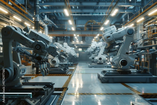 Interior of a modern factory with robotic arms
