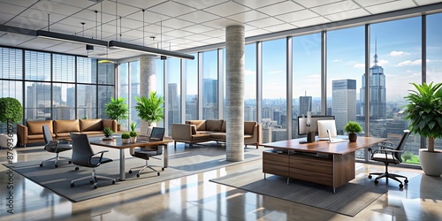 Interior of a modern office building with sleek furniture and large windows, office, modern, interior, building