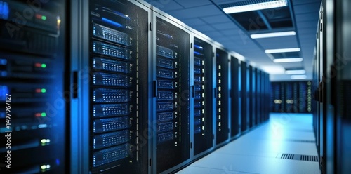 Interior of a secure modern server room with glowing hardware racks and network equipment in blue lighting, ideal for cloud computing, cybersecurity, and IT infrastructure content
