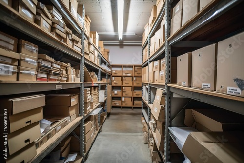 interior of an warehouse full of Spaces and high rising self Where the products are stocked. Generative AI