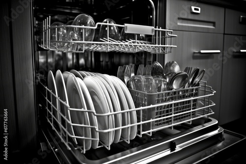 Interior of dishwasher packed with dishes with door open, created using generative ai technology