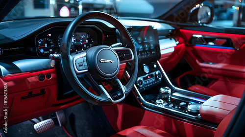 Interior of new modern SUV car with steering wheel shift lever and dashboard climate control speedometer display Red leather interior : Generative AI