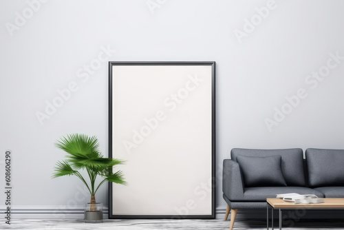 Interior poster mock up with vertical empty wooden frame standing on floor, gray armchair and gree tree in modern white room. Generative AI