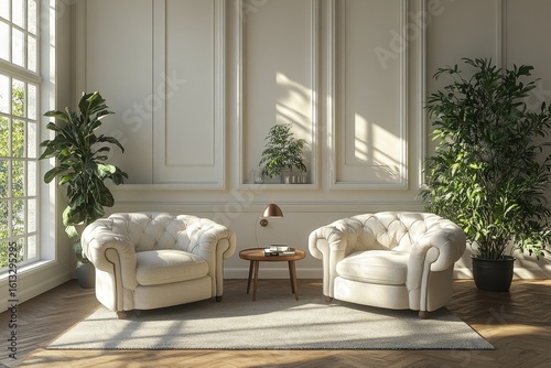 Interior with two armchairs, a coffee table, and a lamp, captured in 3D to demonstrate comfort and design coherence, Generative AI