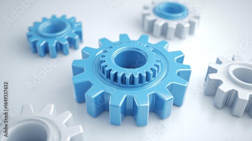 Interlocking blue and white gears symbolizing mechanical cooperation, abstract system concept for engineering or teamwork themes.