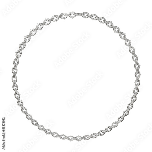 Interlocking Chains: Circular Design. 3D render features sharp-tipped metal chains, expertly interlocking to form a perfect circular frame (transparent PNG background).