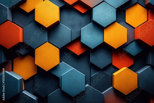 Interlocking hexagons in bold, contrasting colors with subtle shadows to add a 3D effect, perfect for a modern and sleek wallpaper design.