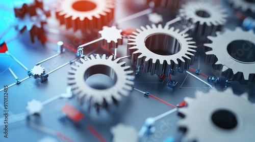 Interlocking Metal Gears with Red and Blue Lines on a Gray Surface