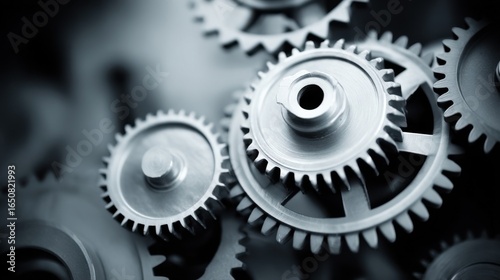 Interlocking metal gears with sharp teeth, silver metallic surfaces contrasting against a dark background,