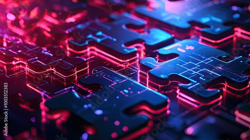 Interlocking neon puzzle pieces floating on a futuristic background, showcasing efficient API integration