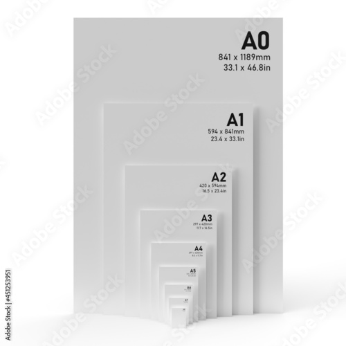 International A series paper size formats from A0 to A8, with black text printed on white textured paper and isolated on a white background. 3D Illustration
