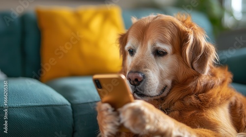 international dog day. A dog using a smartphone while relaxing on a couch.