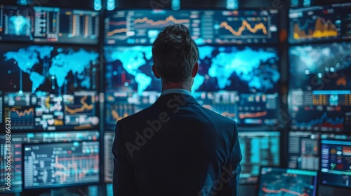 International finance expert analyzing global market trends on multiple digital screens in a modern office