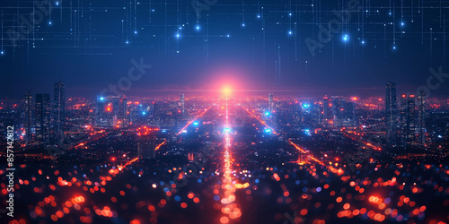 Internet and network infrastructure in a hyper connected world. A night time cityscape, a multitude of glowing, streaming lights, symbolizing the rapid data flow and connectivity of modern urban life.
