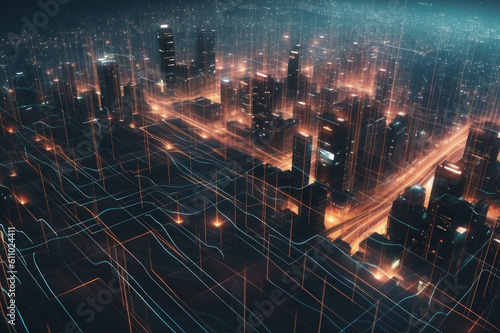Internet networks over the city, cyberspace, neon light. The concept of the future. AI generative.