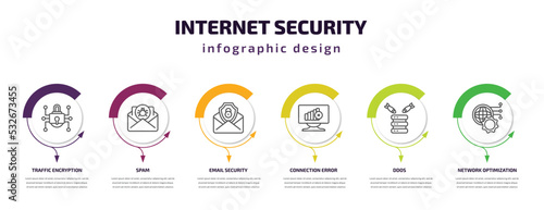 internet security infographic template with icons and 6 step or option. internet security icons such as traffic encryption, spam, email security, connection error, ddos, network optimization vector.