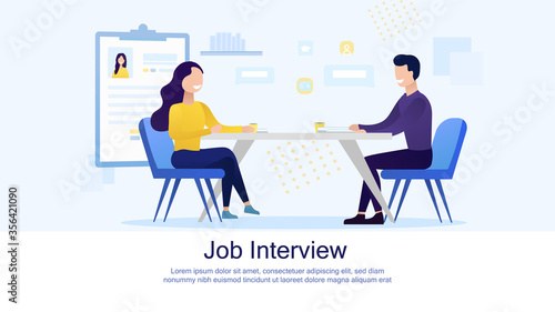 Interview, Negotiation, Meeting Flat Landing Page Mockup. Man and Woman Having Business Conversation. HR Manager and Job Seeker. Flat Vector Illustration