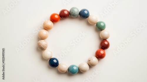 Interwoven prayer beads, each bead representing a different faith, laid out in a circle on a soft, neutral background