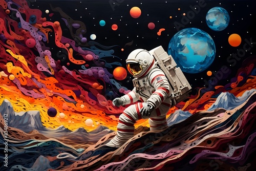 Intrepid Astronaut Navigates Delicate Paper Rocket Through Cosmic Tapestry of Celestial Wonders
