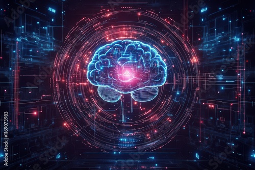 intricate abstract circular pattern featuring a brain symbol at its center surrounded by technological elements representing artificial intelligence concepts