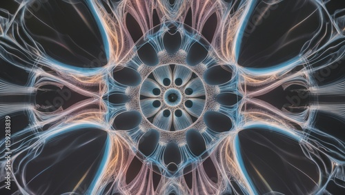 Intricate abstract fractal design featuring luminous colors and symmetrical patterns creating a dynamic and vibrant atmosphere