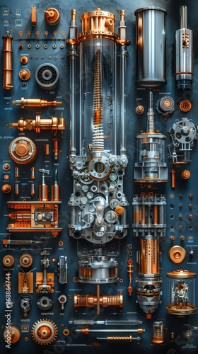 Intricate arrangement of mechanical parts in a vintage steampunk style, showcasing gears, pipes, and metallic components.