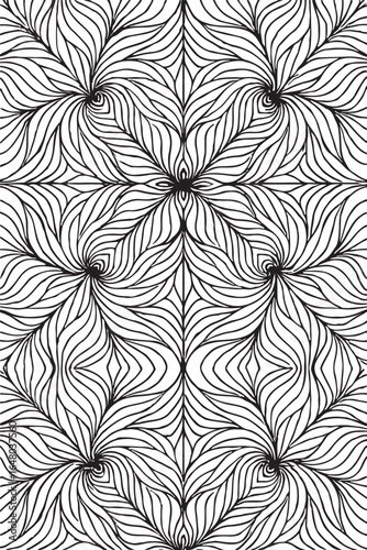 Intricate black and white abstract geometric pattern with flowing organic lines creating a symmetrical floral or feather like design