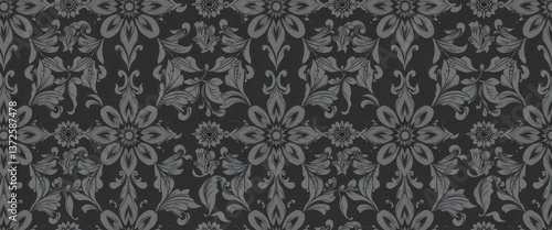 Intricate charcoal grey floral pattern, seamless repeat, backdrop, sophisticated, black and white