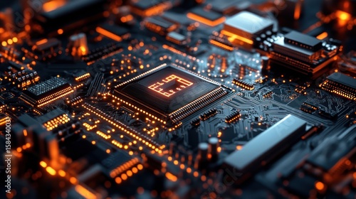 Intricate close-up of a computer motherboard with glowing orange circuit pathways