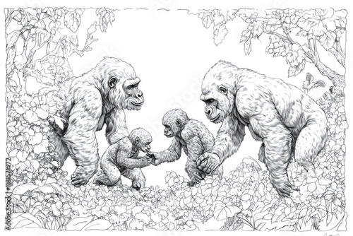 Intricate coloring page featuring a family of gorillas interacting in a lush jungle setting