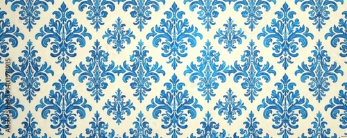 Intricate damask pattern in shades of blue and white on a cream background , damask, sophistication, white
