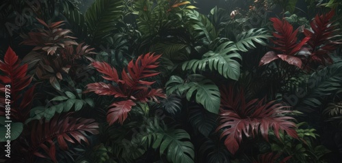 Intricate dark green & crimson tropical leaves, lush jungle foliage , vines, illustration, crimson