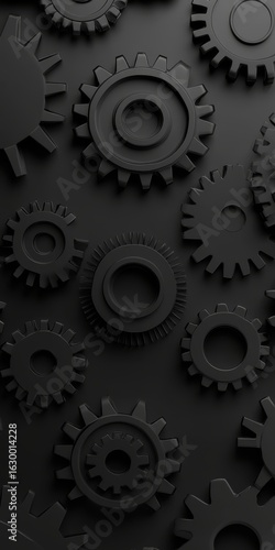 Intricate Dark Mechanical Gears Ensemble with Futuristic Elements and Motion Aesthetic in Black Tone